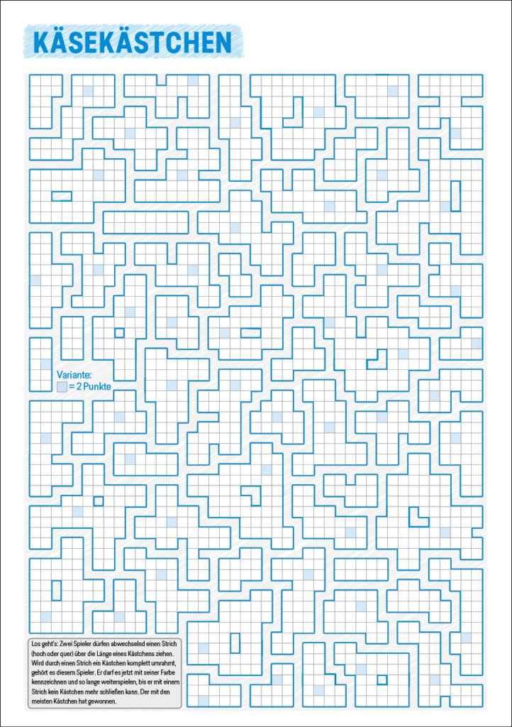 Wie geht das spiel käsekästchen. Wenn du ein kästchen erobert hast musst du gleich noch einen zug machen und kannst so vielleicht gleich ein weiteres kästchen bekommen. In der zweiten phase wird nur geerntet. Das ziel des spiels ist es so viele kästchen zu umranden wie möglich. Käsekästchen ist demnach ein spiel deren struktur schon in der ersten spielphase festgelegt wird.